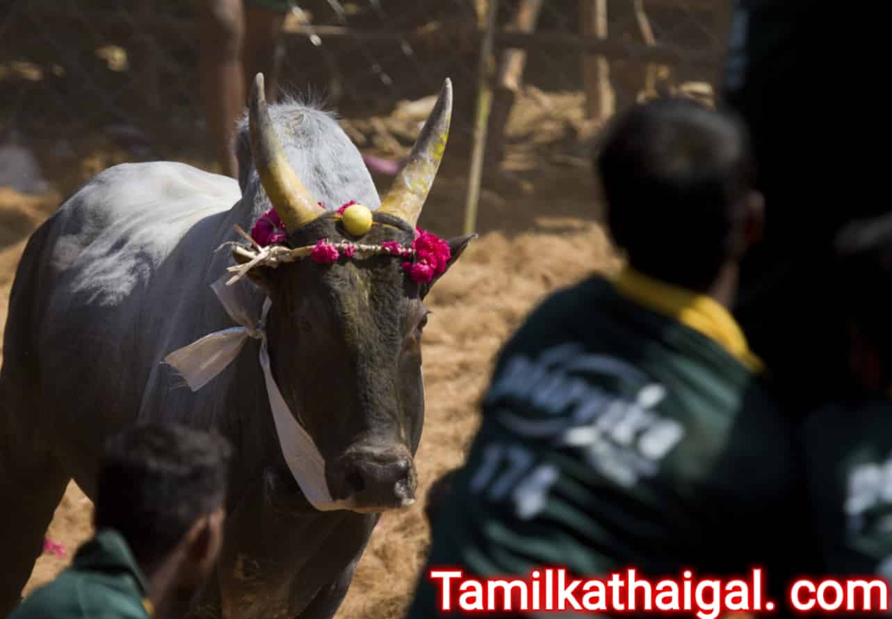 ஓரத்தில் நின்றிருந்த குமரேசன், என்ன ஏதுவென்று ஆராய்ந்து பார்த்தான். கோயிலுக்கு நேர்ந்து விட்டிருந்த கோயில் ‘காளைமாடு’ ஒன்று கூட்டத்திற்குள் புகுந்து வந்து கொண்டிருந்தது. கூட்டத்தினர் அங்குமிங்கும் ஓடினரே ஒழிய ஒருவர் கூட அக்காளை மாட்டை மடக்க முன்வரவில்லை.